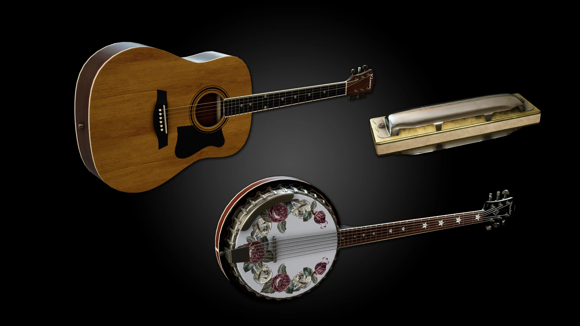 - You have a guitar, banjo and harmonica.